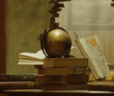 Items on this shelf -armillary with arrow, turtle shell, stuffed pheasant, candle holder